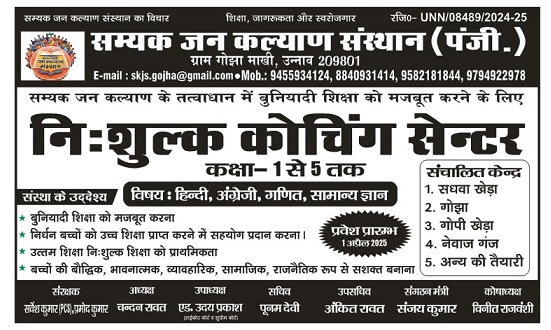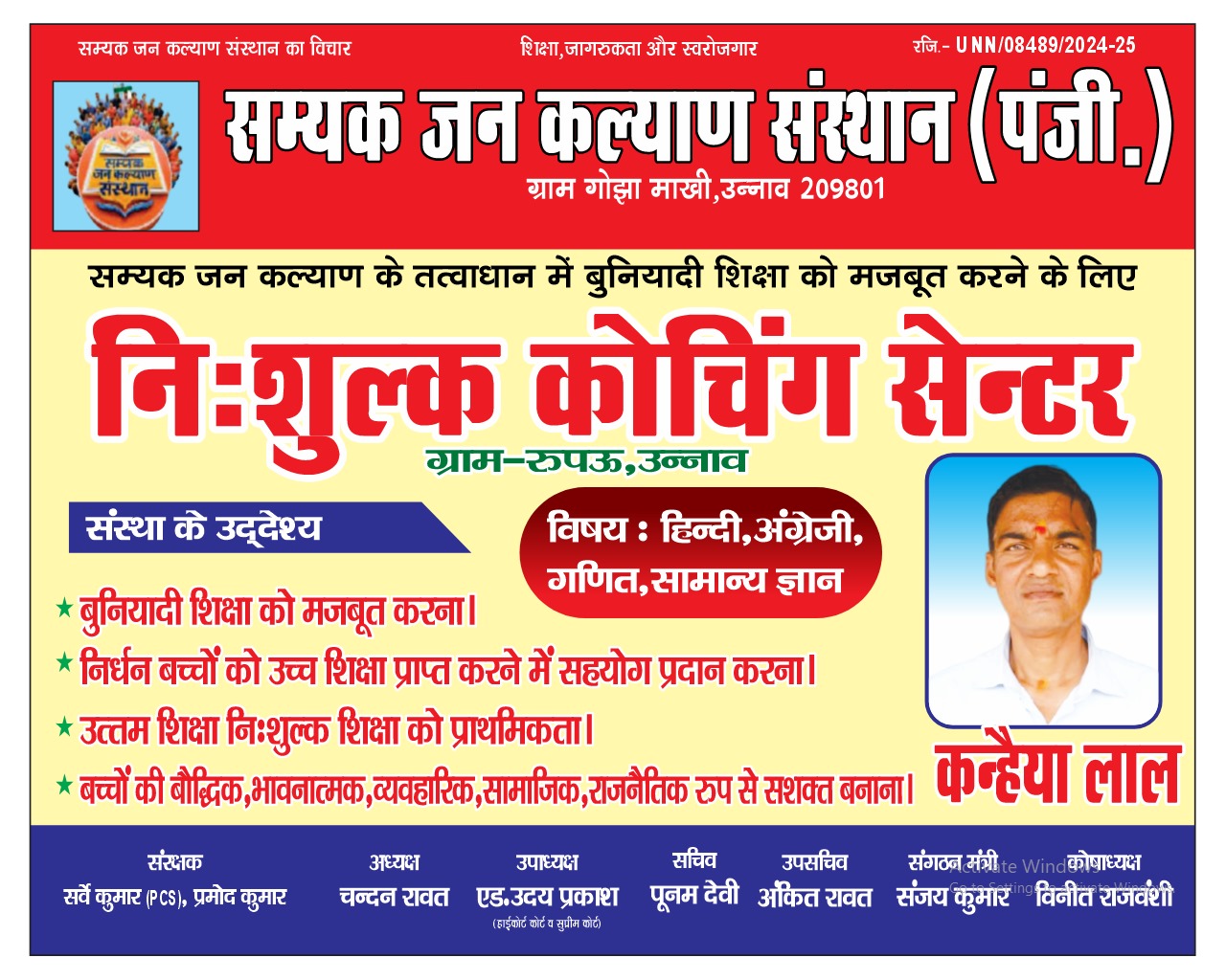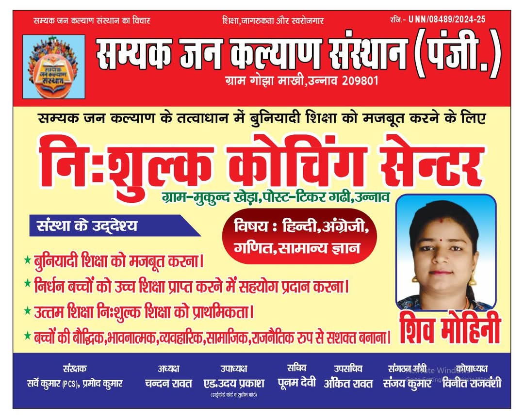 दिनांक 30 may 2025 को ग्राम मुकुंद खेड़ा पोस्ट टीकर गाड़ी जिला उन्नाव में सम्यक जन कल्याण संस्थान द्वारा निशुल्क कोचिंग सेंटर का उद्घाटन सम्यक जन कल्यान संस्थान के पदाधिकारियो द्वारा किया गया